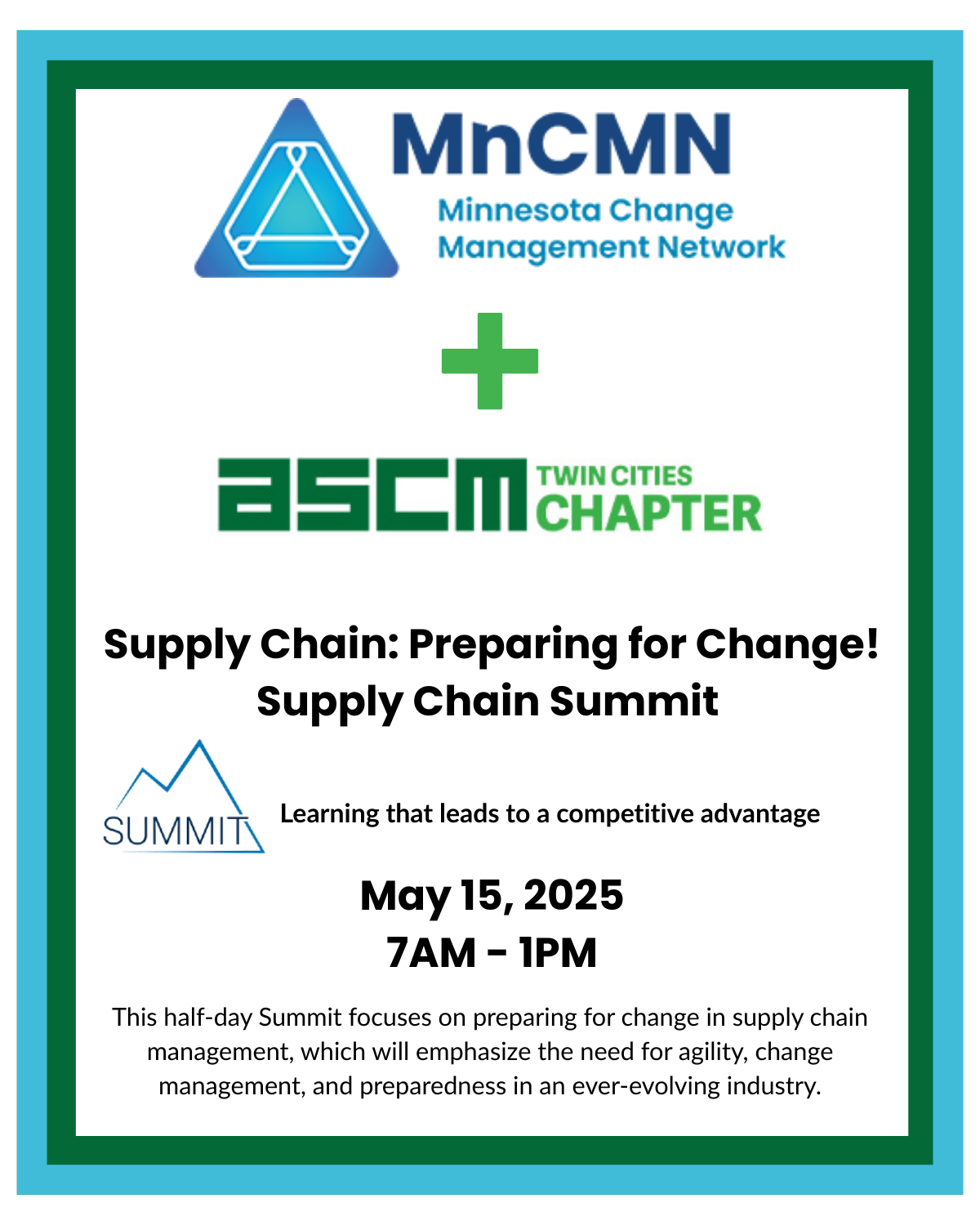 MnCMN, in partnership with ASCM Twin Cities, is thrilled to invite you to the "Supply Chain: Preparing for Change!" event. This is the 3rd Annual Supply Chain Summit for the Twin Cities chapter of the Association of Supply Chain Management! This half-day Summit focuses on preparing for change in supply chain management, emphasizing the need for agility, change management, and preparedness in an ever-evolving industry.